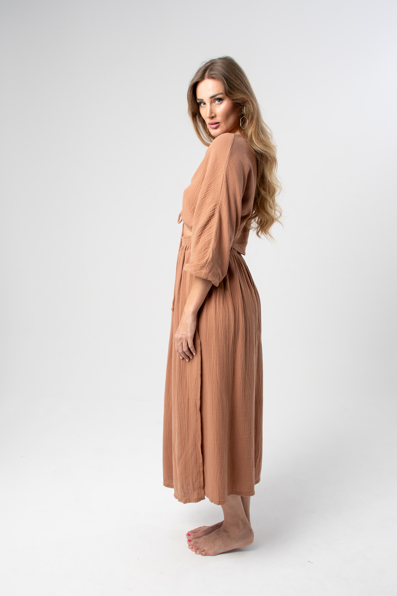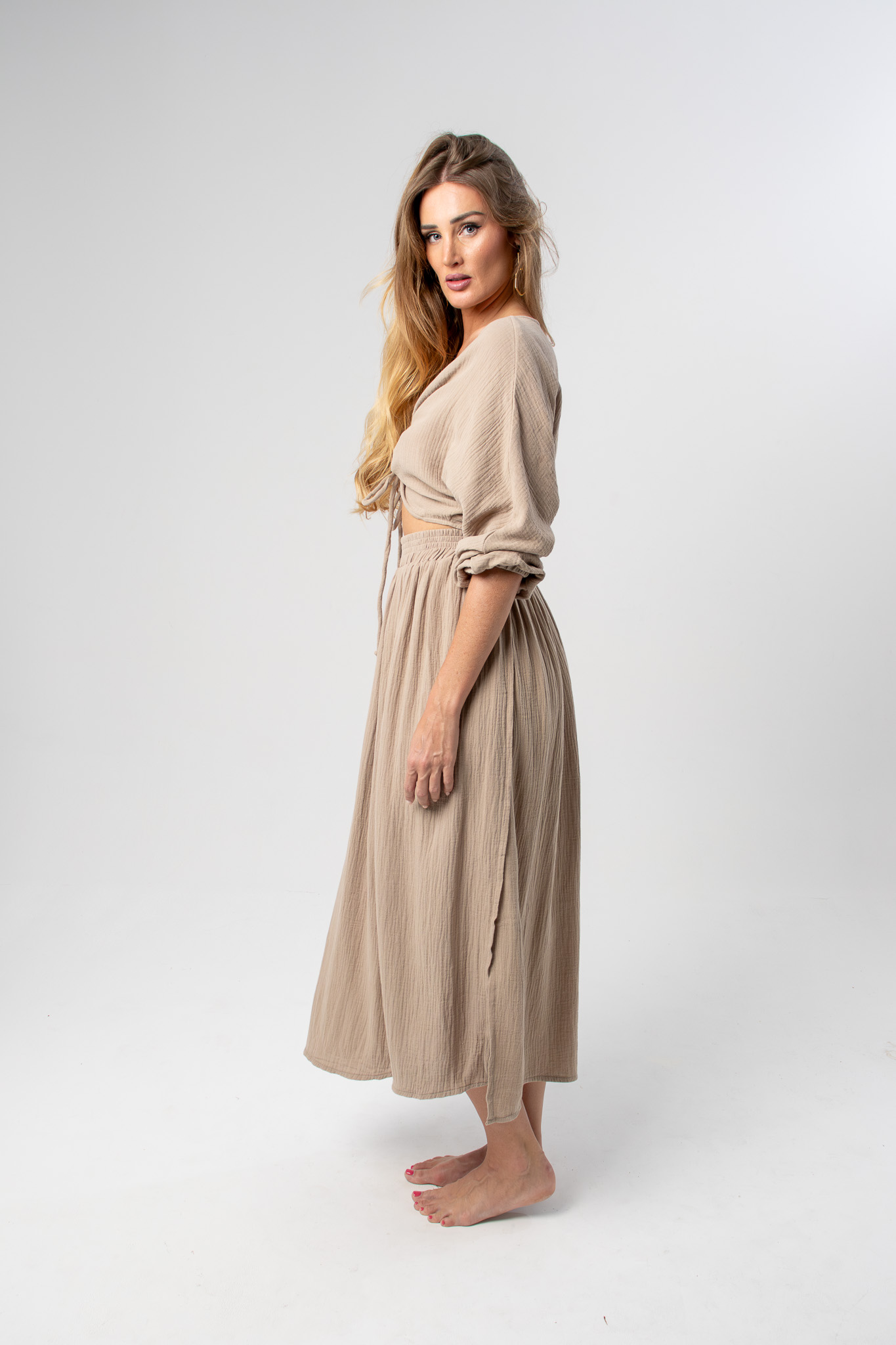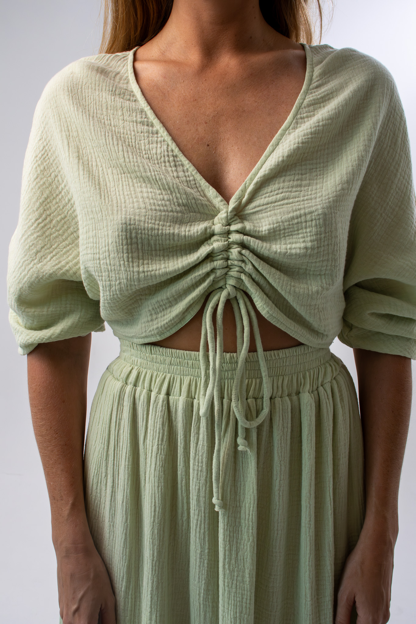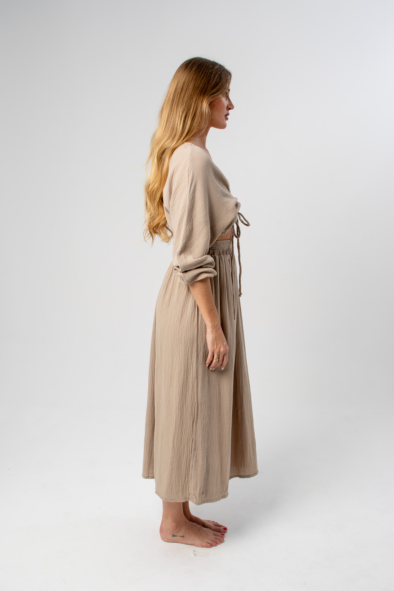 The Nouri Qunneth Top in 100% muslin cotton features a charming front bow detail. Lightweight and breathable, it’s perfect for warm days and pairs easily with various bottoms for a chic, effortless look!